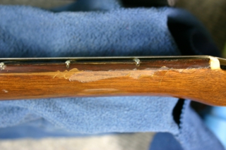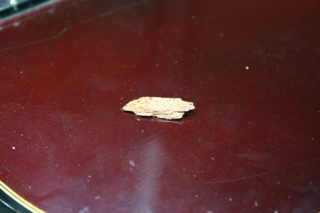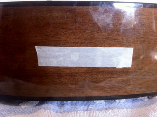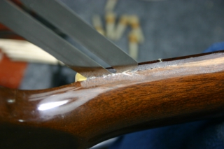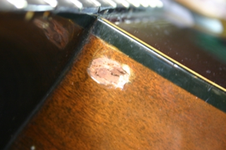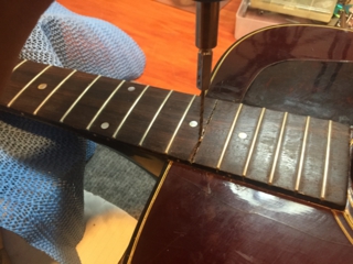 ナット近くのフィンガーボード剥がれ、塗装剥がれ、ショルダー部の穴がありました。