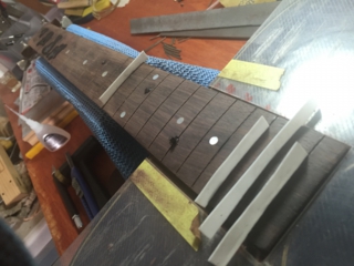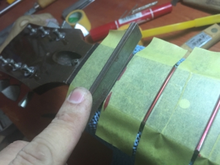 これから、フレットの擦り合わせ。マスキングテープで指板を保護し、赤のペンでしるしをつけます。