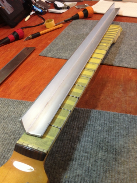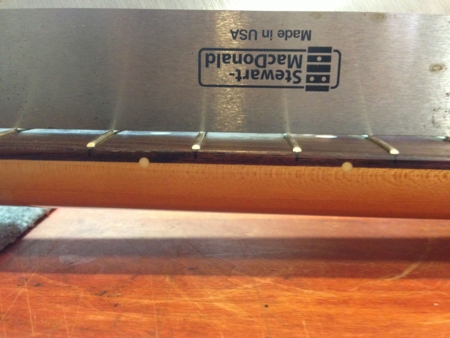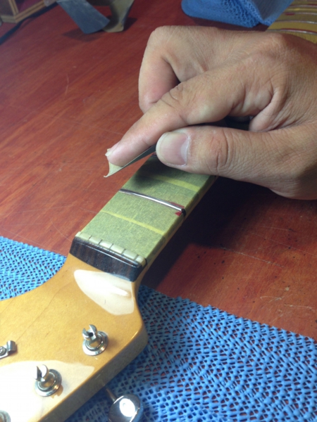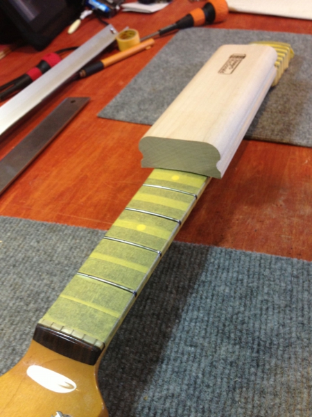 フレットの頭を指板と同じ形状にするヤスリ(さっき計測した円周と同じ円周のブロックを使います)を交互に使いながら高さを合わせていきます。