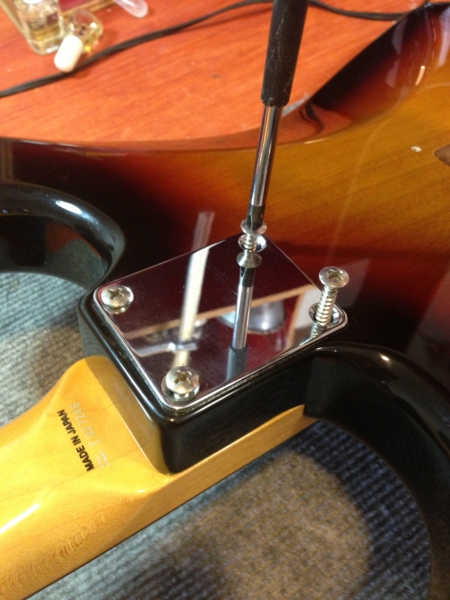 ここから、ネックはボディに正しい角度で戻して、ブリッジの調整。